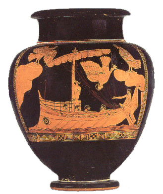 Odiseo y las SirenasΑἱ δὲ Σειρῆνες ἦσαν Ἀχελῴου καὶ Μελπομένης μιᾶς τῶν Μουσῶν θυγατέρες, Πεισινόη Ἀγλαόπη Θελξιέπεια. τούτων ἡ μὲν ἐκιθάριζεν, ἡ δὲ ᾖδεν, ἡ δὲ ηὔλει, καὶ διὰ τούτων ἔπειθον καταμένειν τοὺς παραπλέοντας. [19] εἶχον δὲ ἀπὸ τῶν μηρῶν ὀρνίθων μορφάς. ταύτας παραπλέων Ὀδυσσεύς, τῆς ᾠδῆς βουλόμενος ὑπακοῦσαι, Κίρκης ὑποθεμένης τῶν μὲν ἑταίρων τὰ ὦτα ἔβυσε κηρῷ, ἑαυτὸν δὲ ἐκέλευσε προσδεθῆναι τῷ ἱστῷ. πειθόμενος δὲ ὑπὸ τῶν Σειρήνων καταμένειν ἠξίου λυθῆναι, οἱ δὲ μᾶλλον αὐτὸν ἐδέσμευον, καὶ οὕτω παρέπλει. Apolodoro, Epítome VIII, 18-19  |